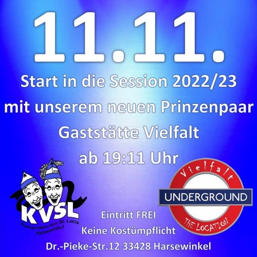 Der KVSL steht in den Startlöchern, nach der Pandemiepause hofft der Verein endlich wieder eine komplette Session feiern zu können. Gestartet wird am 11.11. um 19:11 Uhr im Underground der Gaststätte Vielfalt, mit der Proklamation des 28. KVSL Prinzenpaares.