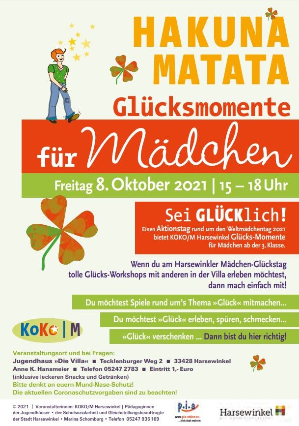 „Wenn ihr Glück erleben, spüren, schmecken und verschenken möchtet, dann kommt vorbei“ fasst Anne Hansmeier vom Jugendhaus „Die Villa“ das Konzept vom Mädchen-Glückstag zusammen. Der Eintritt kostet einen Euro. Darin enthalten sind bereits Leckereien und Getränke für den Nachmittag. Eine Anmeldung für den Mädchen-Glückstag ist nicht nötig. Wer Fragen hat kann sich an Anne Hansmeier, Jugendhaus „Die Villa“, Telefon 05247 2783 wenden. Veranstaltet wird der Mädchenaktionstag von KOKO/M (Pädagoginnen der Jugendhäuser, Schulsozialarbeit und Gleichstellungsbeauftragte der Stadt Harsewinkel).