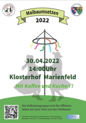 Zum 38. Mal stellt die Volkstanzgruppe Marienfeld den Maibaum im Klosterdorf auf. Dies ist unser Beitrag, um Brauchtum und Zusammenhalt beizubehalten und zu fördern. Unterstützt werden wir wieder von den Offizieren des Heimatvereins, die sich um die Getränke kümmern. Selbstgemachte Kuchen, frischer Kaffee sowie Maibowle sind an der Café Bar der Volkstanzgruppe zu bekommen. Selbstverständlich alles Corona konform. Der Förderverein der Grundschule wird Waffeln backen und so das Fest bereichern und die Kinder der Grundschule erhalten die Möglichkeit, ihre Wünsche für dieses Jahr in Form einer Karte zu gestallten. Die Karten werden dann auch am Maibaum für alle sichtbar angebracht.