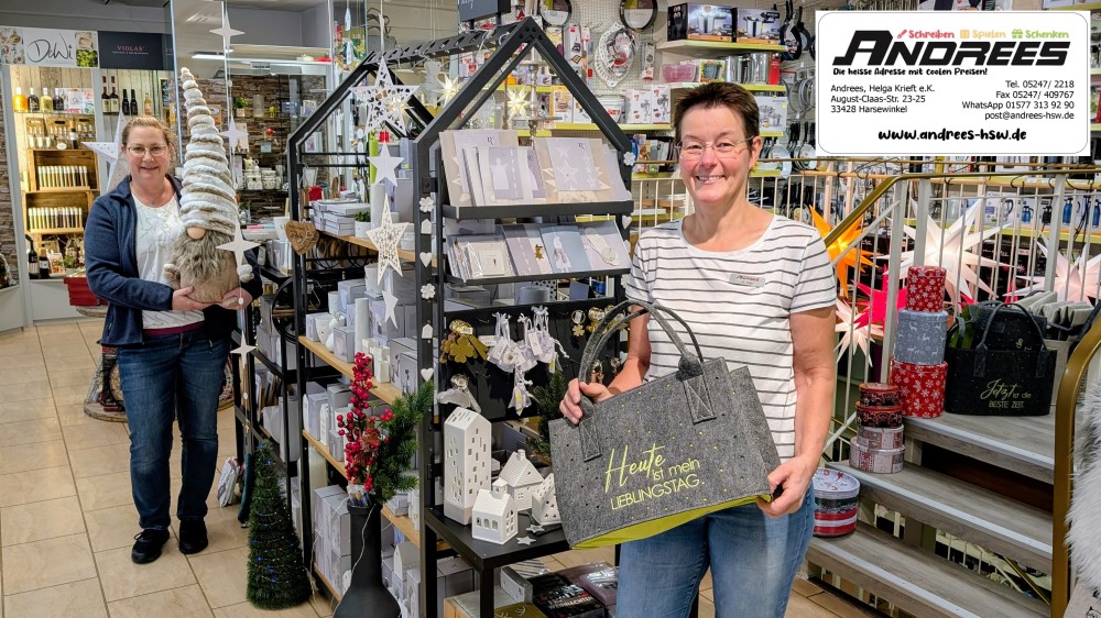 Ganz besondere Highlights sind u. a. die vielen neuen Produkte von Herstellern aus unserer Region. Mit süßem Honig vom Imker Austermann in Marienfeld und Feinkostspezialitäten vom Hofladen Austermann oder von Wajos kannst Du Deine Liebsten auf ganz außergewöhnliche Weise überraschen. Du kannst Dich beim Weihnachtsshopping bei Andrees auch einfach in die verzaubernde Welt der X-MAS-Deko entführen lassen. Unsere Angebotspalette reicht über alles, was man gern schenkt und geschenkt bekommt. Mit viel Liebe gemachtes Design und mit Andrees von Herzen verschenkt. Auf Wunsch werden alle Geschenke festlich verpackt.